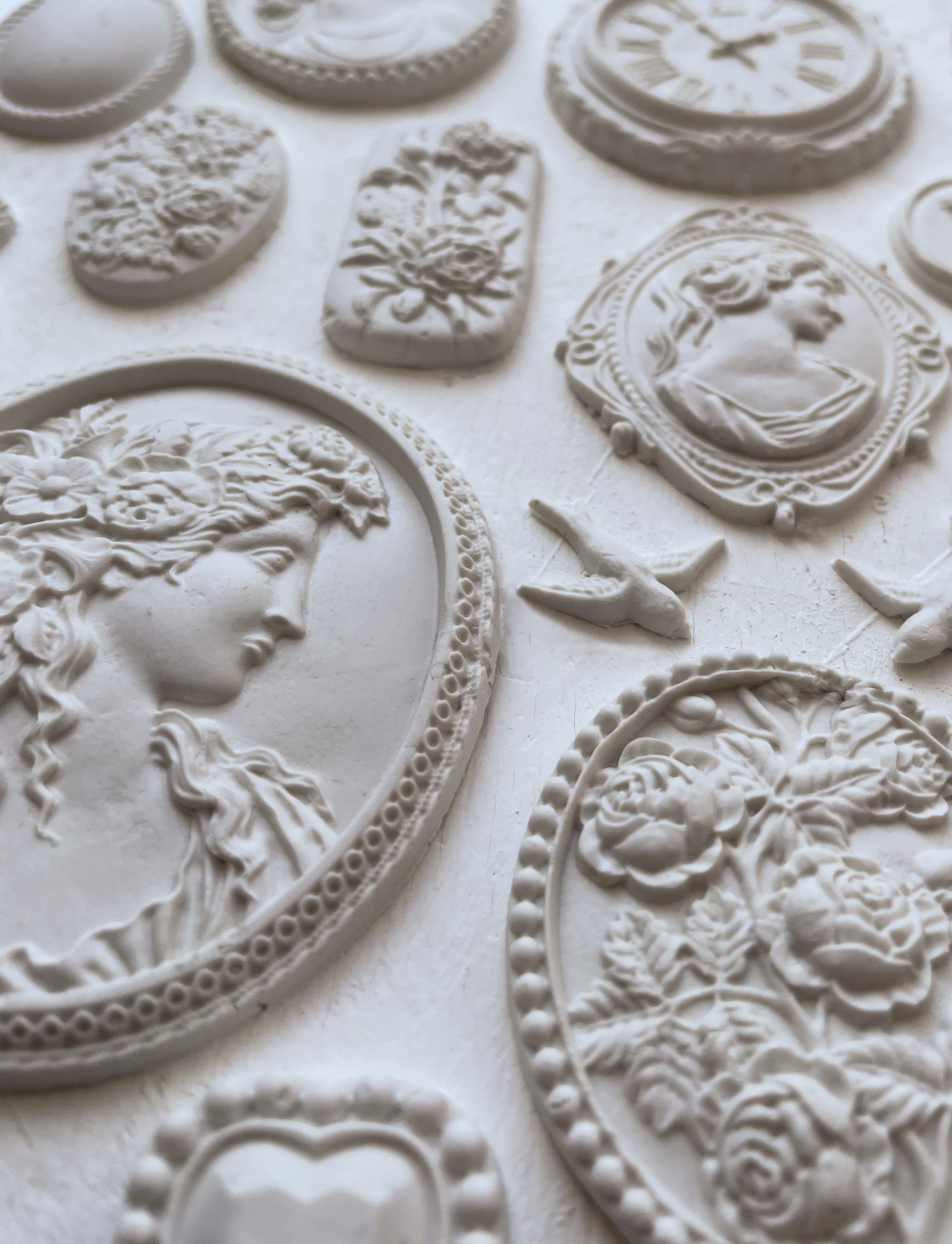 The IOD Cameos Mould is a sophisticated and highly detailed silicone mould designed to create beautiful cameo castings. It features a variety of classic female silhouettes in different sizes, along with an intricate decorative frame. The castings are perfect for adding a touch of vintage, Victorian, or romantic flair to furniture and craft projects. This mould is ideal for creating unique statement pieces, jewelry, or embellishments for mixed-media art.